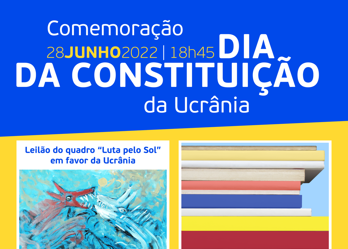 O Dia da Constituição da Ucrânia é celebrado esta terça-feira, 28 de junho. O Consolata Museu, localizado em Fátima, vai assinalar esta data, através de duas ações, que terão início pelas 18h45. Uma das ações prevê o leilão de um quadro que se encontra patente numa mostra temporária atualmente presente naquele museu. A obra é intitulada “Luta pelo sol”, e é oferecida pelo seu autor, Francisco Silva, que estará presente na sessão, “em favor da Ucrânia”.