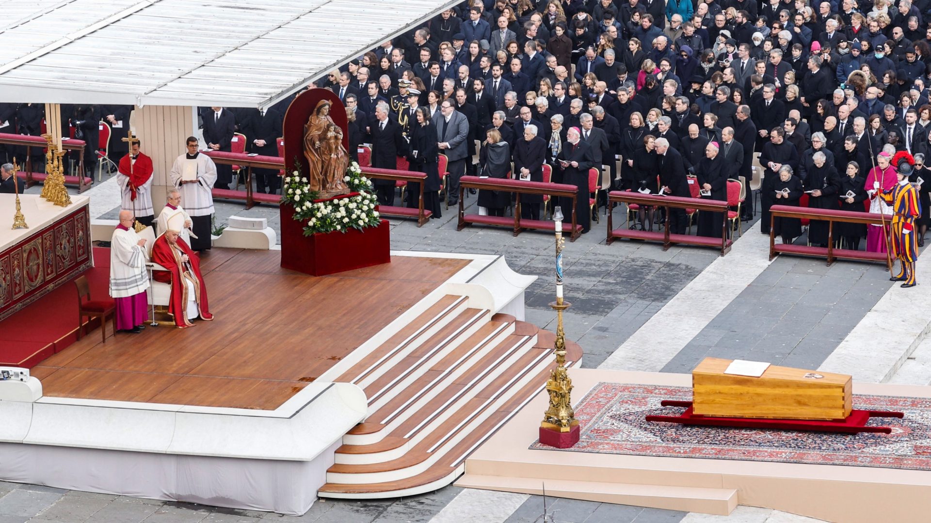 Milhares de fiéis deslocaram-se até à Praça de São Pedro, no Vaticano, para marcarem presença no funeral do Papa emérito Bento XVI, que está a acontecer esta quinta-feira, 5 de janeiro, desde as 09h30 locais, menos uma hora em Lisboa. A presidir à celebração está o Papa Francisco.